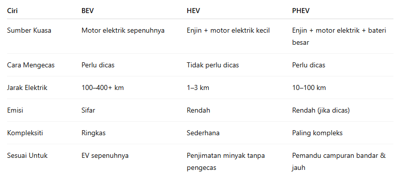 Dunia automotif kini sedang mengalami perubahan besar. Jika dahulu pembeli hanya perlu memilih antara petrol atau diesel, kini istilah seperti BEV, HEV, dan PHEV mula menjadi sebutan utama di Malaysia. Ramai pengguna keliru dengan pelbagai singkatan dan teknologi baharu ini, sedangkan pemahaman yang betul boleh membantu membuat keputusan pembelian yang lebih bijak.